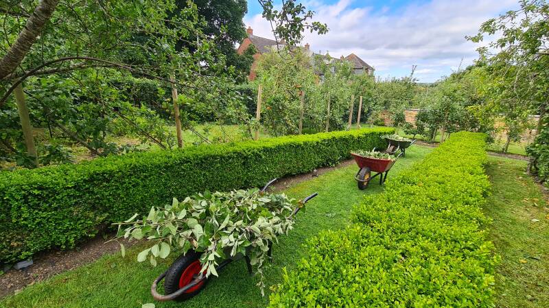 I spent a great day alongside brilliant Head Gardener Neil Munro at the historic Hill Close Gardens in Warwick. They've a wonderful collection of apple trees, many of which are heritage varieties and it was such a pleasure to work on the trained forms for their summer pruning. Very different in purpose to winter pruning, in the summer it's all about letting light in to help ripen the fruit and to improve airflow through the trees to help limit attack by pests such as woolly aphid and diseases such as powdery mildew. Concentrate on pruning back only the vigorous (usually vertical) new growth, distinguished as a different colour to the previous years growth which should be visible above the rings or scars of the basal leaf cluster. This will generate a surprising volume of prunings, as can be seen in our wheelbarrows here, but this will lessen the work to do in winter when you're looking to work on the shape and form of the trees. All these young shoots can be cut back to between 3-5 buds above the basal cluster, making your cut above a outward facing bud. Check not to remove the shorter growth (probably 20cm or less) terminating in fruiting buds - these will be rounded/furry whereas leaf buds will be flat/scale-like. With espaliers you must leave a leader on every branch (tying it in before starting pruning is a good idea) and with a cordon leaving the leader at the top. This will ensure any rush of new growth after pruning will go into the leader. Doing this should hopefully promote the formation of fruiting spurs in subsequent years and the tree will look really tidy as a result too.